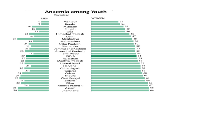 The above figure shows a wide variation in the prevalence of anemia among the Youth State wise. In most states at least one-half of young women are anemic and at least one-fifth of men are anemic.